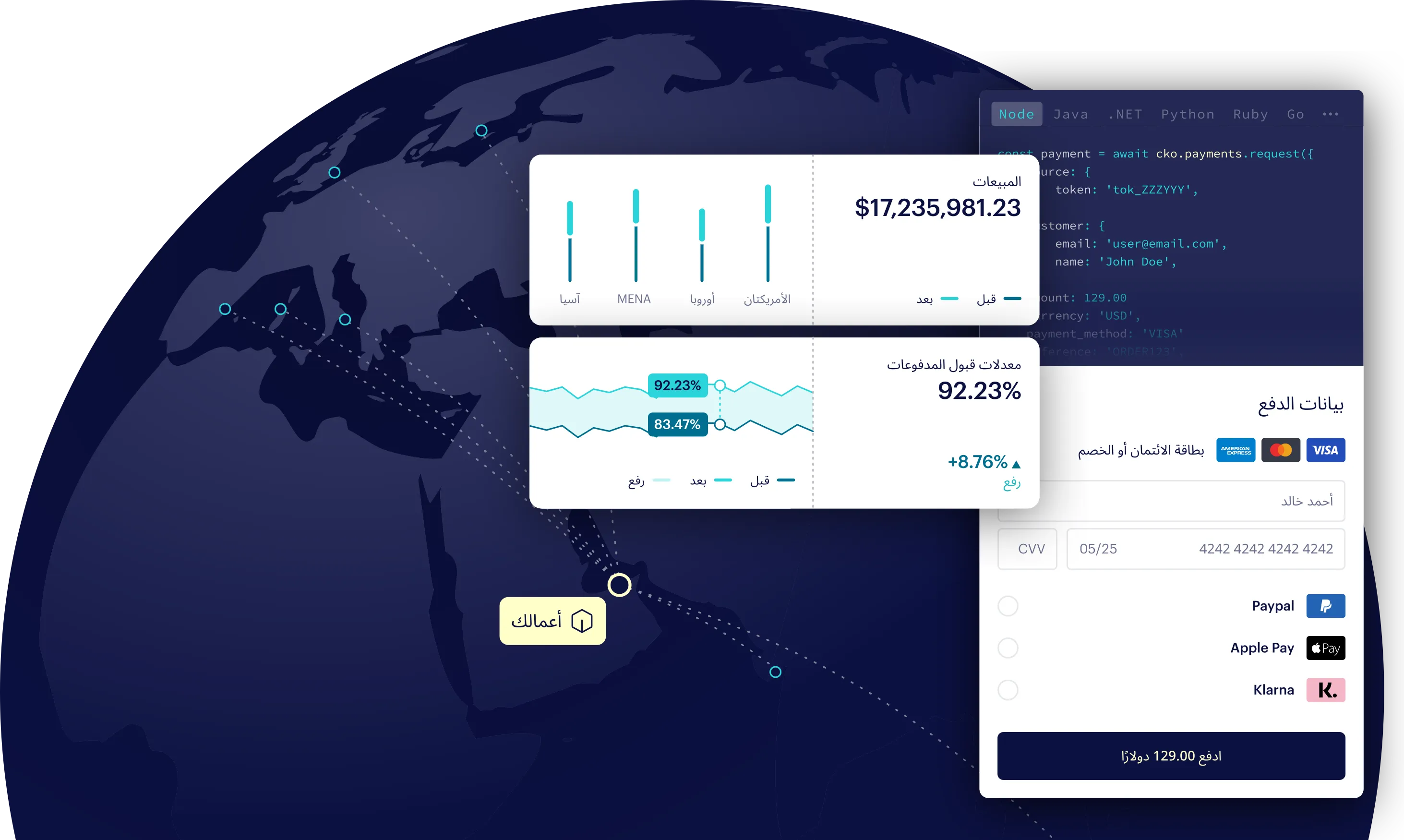 نفّذ المدفوعات في أي مكان عبر منصّة دفع عالمية تدعمها خبرات واسعة لمساعدتك على تحقيق قيمة أكبر في كل معاملة.
