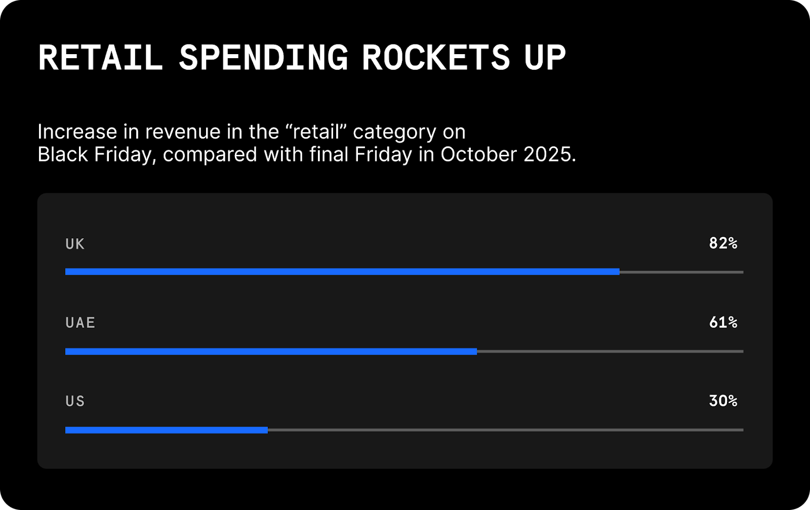 For the purposes of reporting, our BFCM figures are compared with the equivalent day of the previous month (for example, Black Friday revenue is compared with revenue of the final Friday of October). All spending relates to online transactions only (for instance, via desktop or mobile).