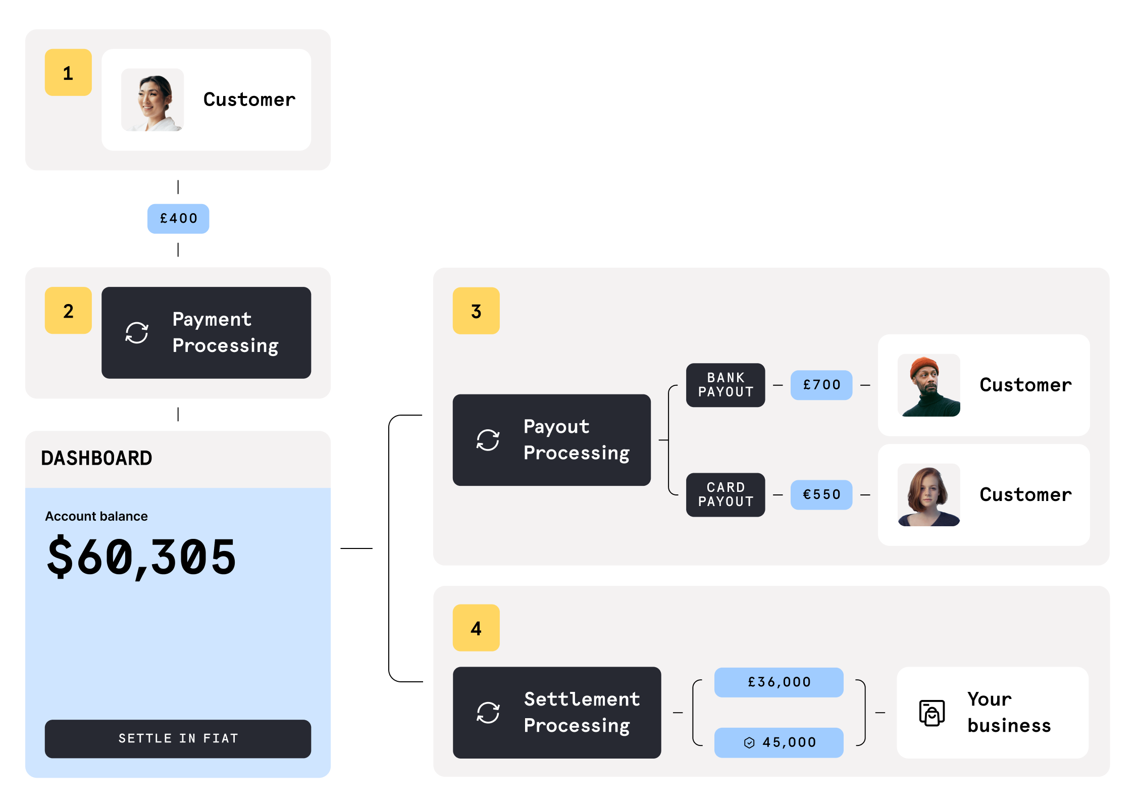 Acepta y envía pagos mediante una única integración. Nuestra tecnología flexible, las licencias de adquirencia local y nuestra experiencia sobre el terreno te permiten mover el dinero dentro y fuera de tu negocio a escala. En todas las regiones y divisas, tanto dinero fiat como criptomonedas.