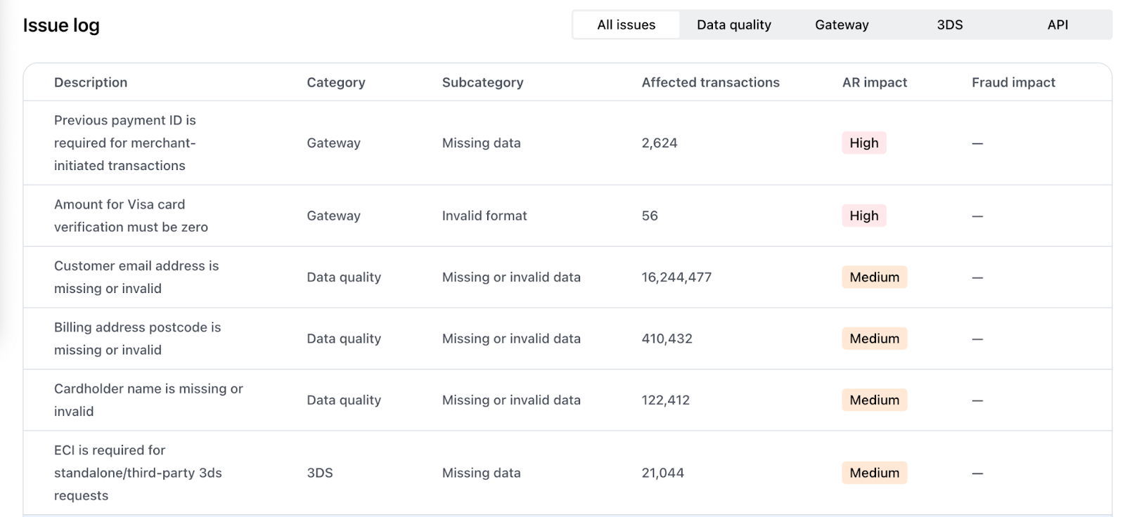 Le coût d’une mauvaise hygiène des données ne cesse d’augmenter. Les commerçants les plus avancés utilisent des outils comme Integration Health non seulement pour détecter les erreurs, mais aussi pour capturer de manière proactive l’ensemble des données nécessaires et sécuriser ces réductions de frais et gains de taux d’acceptation.