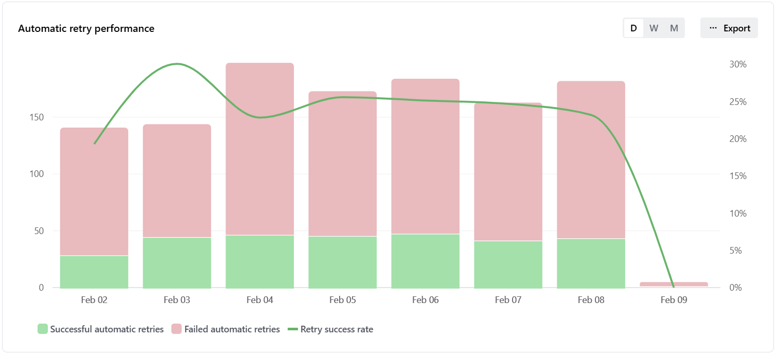 Use our improved decline insights to receive more intuitive and actionable information. Our updated views help you understand whether you’re seeing declines on first attempts or later retries and explore trends - over time and across your payment mix.