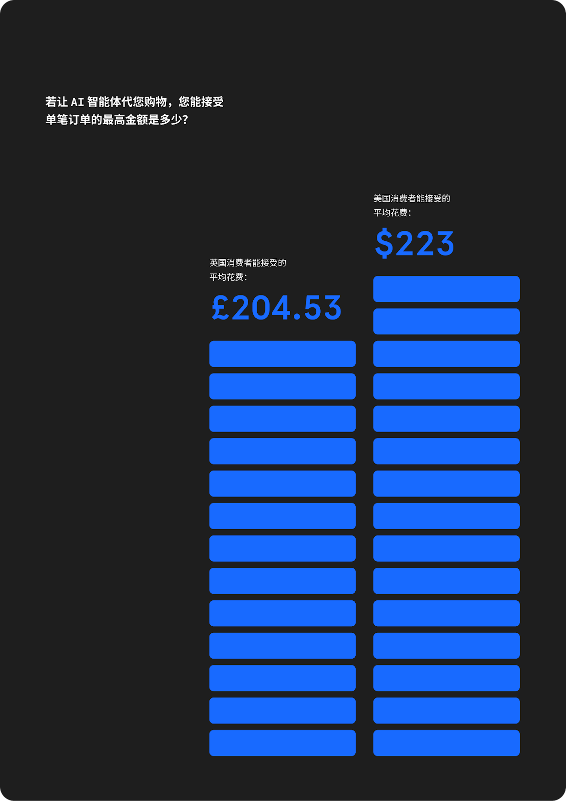 英国消费者表示,他们平均愿意授权 AI 代其支出 204.53 英镑,而美国消费者的这一数字为 233 美元。这些数据意义深远,表明消费者并未排斥智能体代买模式,但为其设定了明确的界限。