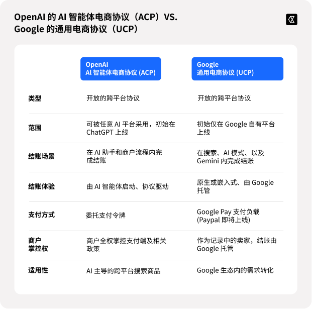 两者的共同目标是减少订单摩擦,打造原生、流畅且可信的 AI 购物体验。然而,它们在体验的交付方式、落地场景以及商户角色上存在差异。